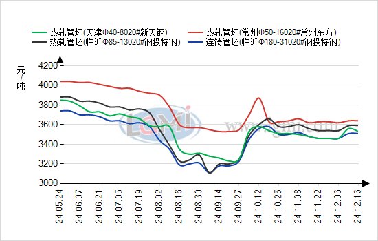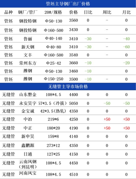晨管坯出厂以及市场报价大部分持稳,周末期间临沂钢投和常州东方管坯出厂报价暂稳,现20#热轧管坯出厂报价3530-3790元,20#连铸管坯出厂报价3400-3650元。经过上周管坯市场价格小幅下跌,目前商家的恐慌情绪较浓,不过期钢盘面周五夜盘触及新低反弹后,今晨开始震荡上行,钢厂当前12月份合同已经饱和,趁机稳价的意愿较强,预计今天管坯价格持稳运行。