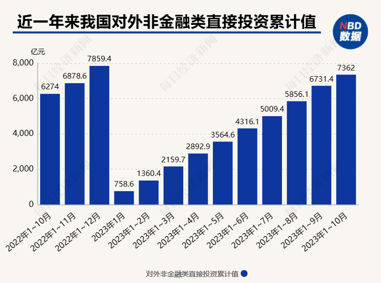 商务部新闻发言人何亚东在发布会上介绍,2023年1-10月,我国对外投资持续增长,对外非金融类直接投资7362亿元人民币,同比增长17.3%(折合1047.4亿美元,同比增长11%)。