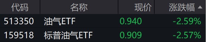 今日场内油气ETF、标普油气ETF跌逾2.5%。