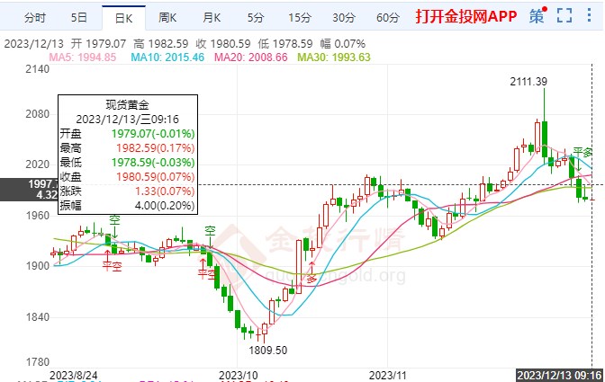 12月13日(周三),贵金属盘内行情整体偏稳,黄金价(1994.43, 1.23, 0.06%)格1980一线附近波动,白银(22.98, -0.04, -0.18%)盘内22.70附近慢行。