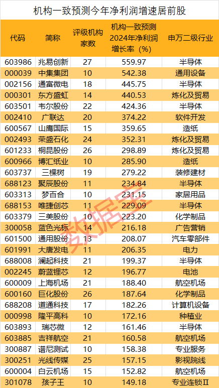 据证券时报·数据宝统计,在去年净利润超1亿元的公司中,获10家以上机构评级且机构一致预测今年净利润增速超100%的公司有52家。其中,18家获机构一致预测今年净利润增速超200%,兆易创新(84.940, 0.17, 0.20%)(603986)、中集集团(10.430, 0.09, 0.87%)(000039)获机构一致预测今年净利润增速均超500%。