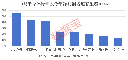 半导体行业公司来看,兆易创新、通富微电(23.060, 0.36, 1.59%)(002156)、韦尔股份(100.700, 0.28, 0.28%)(603501)、聚辰股份(57.510, 0.78, 1.37%)等8家公司获机构一致预测今年净利润增速超100%。其中,韦尔股份、澜起科技(51.430, -0.34, -0.66%)(688008)市值居前。