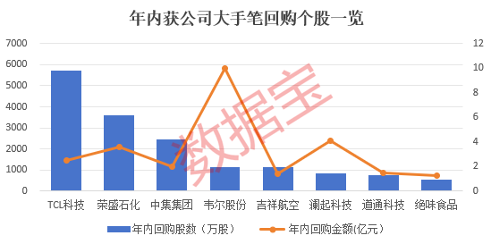 数据宝进一步统计发现,截至6月5日,上述52家公司中,8家公司年内回购(基于公司年内公告加工的数据,下同)超500万股,回购金额均超1亿元。