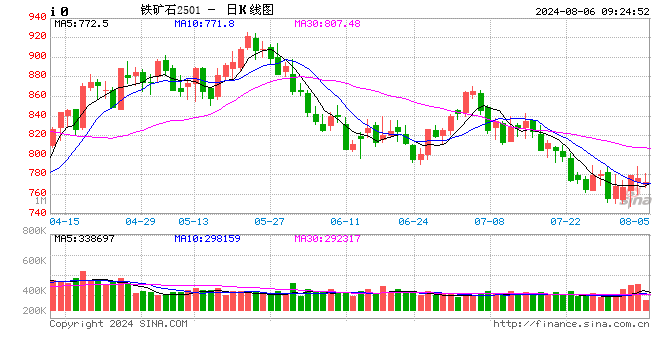 昨日铁矿石期货主力合约i2501价格小幅震荡,收于776.5元/吨,较前一个交易日收盘价下跌2.5元/吨,跌幅为0.32%,持仓增加1.44万手。港口现货价格稳中有跌,成交大幅下降,日照港PB粉价格下跌2元/吨至790元/吨,超特粉价格不变仍为650元/吨,全国主港铁矿累计成交77.4万吨,环比下降22.26%。7月29日-8月4日,Mysteel澳洲巴西铁矿发运总量2535.9万吨,环比增加48.3万吨。澳洲发运量1810.2万吨,环比增加242.0万吨。中国47港到港总量2805.1万吨,环比增加935.9万吨;中国45港到港总量2610.7万吨,环比增加788.7万吨;北方六港到港总量为1379.5万吨,环比增加403.9万吨。铁矿石发运量有所回升,到港量高位继续回升。上周247家钢厂日均铁水产量环比下降2.99万吨至236.62万吨,同比下降4.36万吨。钢厂处于亏损局面,铁水产量仍有下降趋势。预计短期铁矿石盘面震荡整理运行。