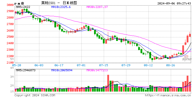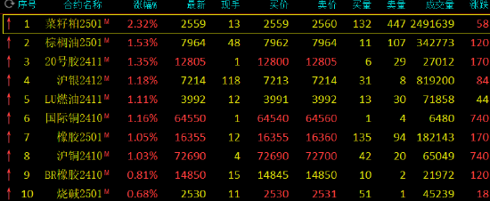 早盘开盘,国内期货主力合约涨跌不一,菜粕(2479, 38.00, 1.56%)涨超2%,棕榈(7878, 112.00, 1.44%)油、LU燃油、20号胶、沪银、橡胶(16250, 65.00, 0.40%)涨超1%。跌幅方面,沪锌(23735, -630.00, -2.59%)跌近2%,集运欧线、纯碱跌超1%。