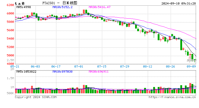 2024年上半年,受市场需求疲软及行业利润不佳聚酯产业链价格整体呈现窄幅波动态势,PTA和PX作为聚酯产业链的关键原料,其价格波动幅度相对较小。进入三季度,8月份宏观外围波动加大,美国经济数据走弱,降息预期强化,股市、商品、汇市均剧烈动荡,市场心态受到明显冲击。成本大跌拖累市场心态,流动性充裕背景下 PX 同样偏弱,价格均创下年内新低。随着原油价格暴跌及聚酯下游5月以来的减产挺价负反馈至原料端,PX-PTA期价跌破上半年的震荡区间下沿,开启暴跌模式弱势探底。截止9月6日PTA2501合约已经跌破5000元/吨,创下2023年以来新低。