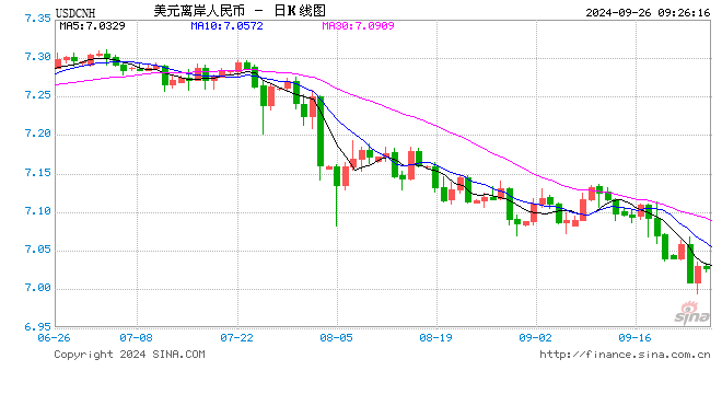 利好消息接踵而来,人民币(7.0340, 0.0022, 0.03%)兑美元快速“破7”,市场为之一振。9月25日,亚洲交易时段早盘,离岸人民币兑美元突破7.0关口,为去年5月以来首次。截至北京时间17:30,离岸人民币汇率最高触及6.99515。