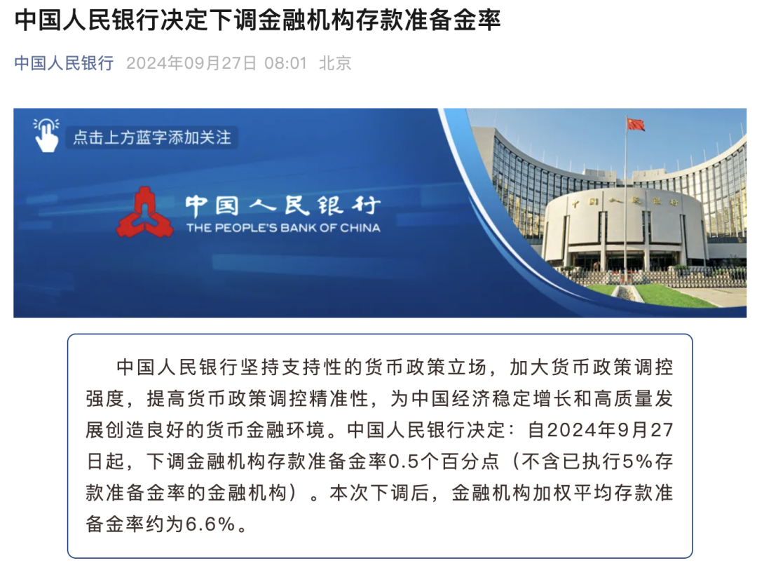 中国人民银行决定:自2024年9月27日起,下调金融机构存款准备金率0.5个百分点(不含已执行5%存款准备金率的金融机构)。本次下调后,金融机构加权平均存款准备金率约为6.6%。