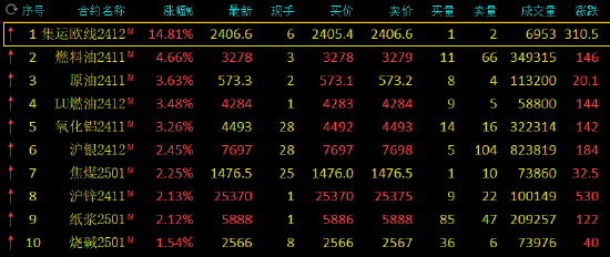 早盘开盘,国内期货主力合约有涨有跌。集运指数(欧线)涨近16%,燃料油(3495, -7.00, -0.20%)、SC原油(607, -8.60, -1.40%)涨超4%,氧化铝、低硫燃料油(LU)涨超3%,焦煤(1556, -15.00, -0.95%)、沪银、纸浆(5686, -32.00, -0.56%)涨超2%。跌幅方面,橡胶(17975, -640.00, -3.44%)跌超3%,20号胶(NR)跌超2%,丁二烯橡胶、菜粕(2479, 38.00, 1.56%)跌超1%。