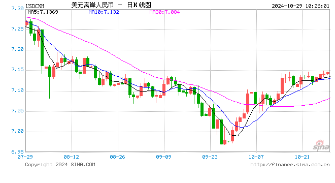 10月29日,人民币(7.1343, 0.0077, 0.11%)中间价报7.1283,上调24点,上一交易日中间价报7.1307。