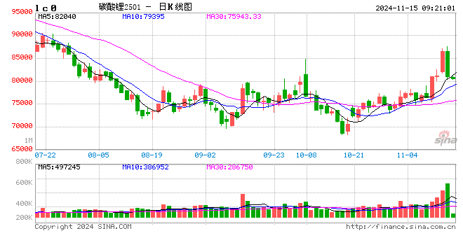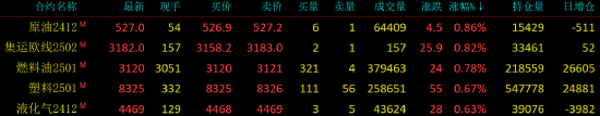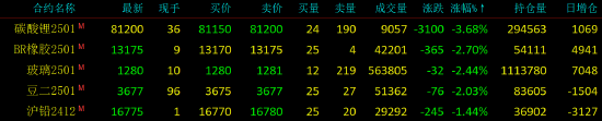 2024年11月15日,期市早盘开盘,国内期货主力合约涨跌不一。碳酸锂跌超4%,丁二烯橡胶(17575, -140.00, -0.79%)、玻璃(1439, -10.00, -0.69%)跌超2%,焦炭(2232, -47.00, -2.06%)、沪铅(19885, 165.00, 0.84%)、沪镍(131810, -1740.00, -1.30%)、纯碱、焦煤(1556, -15.00, -0.95%)、沪锡(273650, 500.00, 0.18%)、豆粕(3111, 18.00, 0.58%)、豆二(3656, 14.00, 0.38%)跌超1%。涨幅方面,SC原油(607, -8.60, -1.40%)、集运指数(欧线)涨近1%。