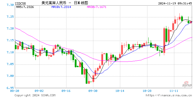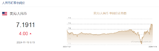 11月19日,人民币(7.2315, 0.0027, 0.04%)兑美元中间价报7.1911元,下调4个点。